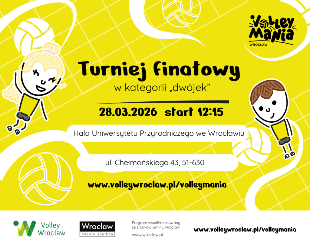 W dniu 28.03.2026 w hali sportowej Uniwersytetu Przyrodniczego we Wrocławiu przy ul. Chełmońskiego 43 odbędą się turnieje finałowe programu Volleymania Wrocław w kategoriach „trójek” oraz „dwójek” dziewcząt i chłopców.
